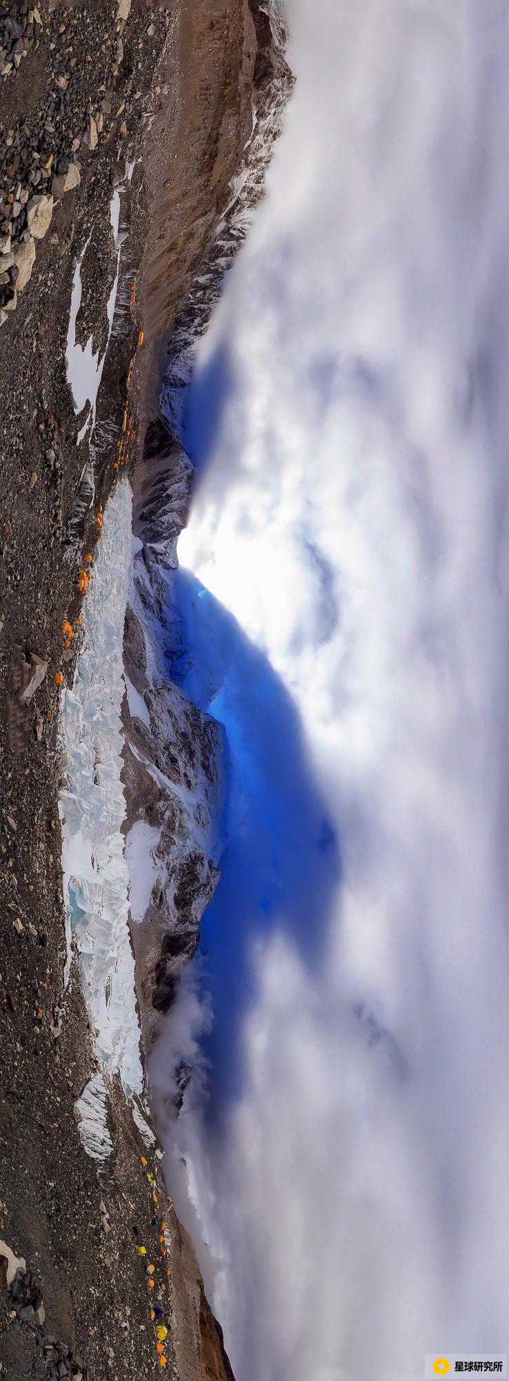 (请将手机横屏观看,帐篷所在之处便是大本营;太阳从珠峰斜后方升起,被山体遮挡住的光线在天空中撕出一条巨大的口子,摄影师@高承)