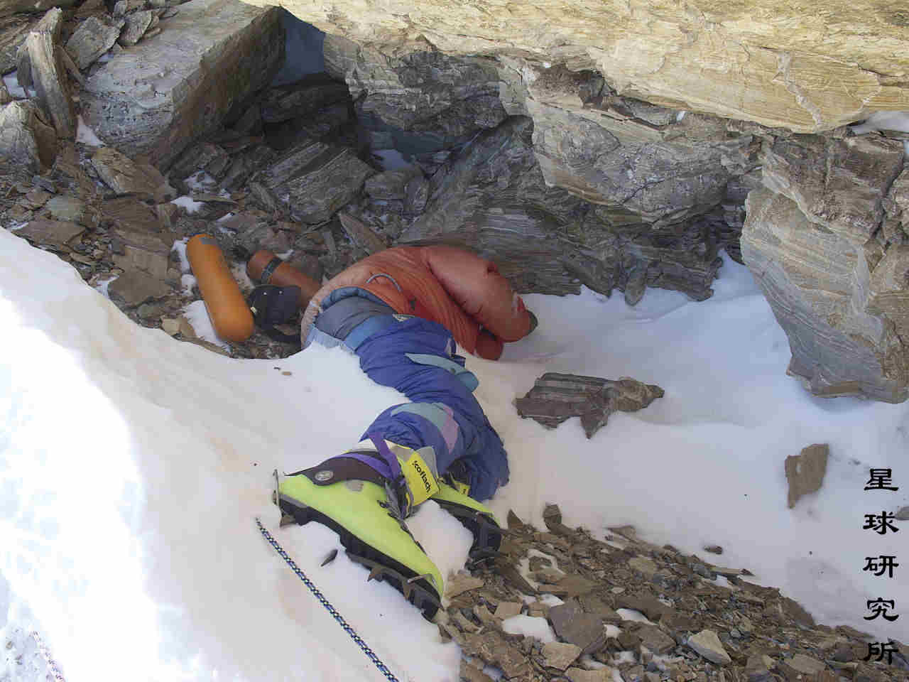 (被登山者称为GreenBoots的遇难者,位于西北山脊8500米处,身份至今不明)