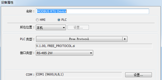 PLC类型选择“FreeProtocal”自由通信协议,接口类型:RS-4852W,COM:COM1,波特率:9600,无校验、8个数据位、1个停止位。