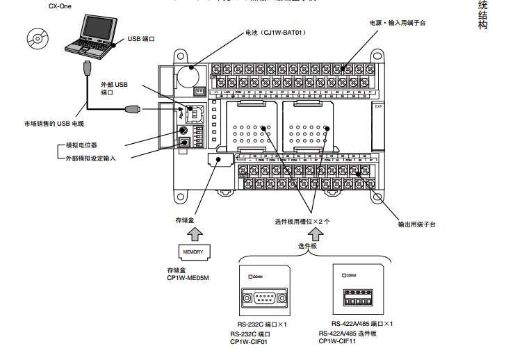 关于cp1系列的cpu硬件。有一个usb口,一个rs232(选配件),一个rs422/485(选配件)。usb口可以用来和电脑上的编程软件通讯,rs232接口可以触摸屏通讯,rs422/485接口可以和其它设备通讯(比如plc和变频器)。看了一遍资料,居然没发现cp系列的plc的以太网模块,这让我很惊讶啊。现在居然还有plc不支持以太网通讯的,这也太落后了吧?瞬间对日系的无感,虽然是小型低端plc。而CP1W-CIF41模块更像一个第三方软件,个人猜测是因为市场需求被迫加上去的,而不是主动设计的。