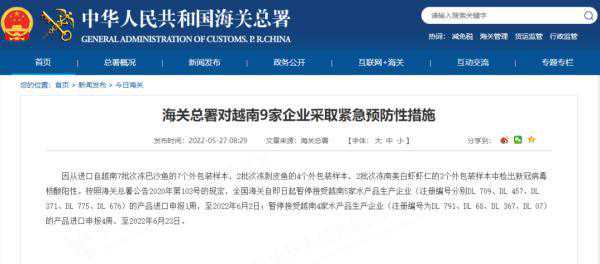 按照海关总署公告2020年第103号的规定,全国海关自即日起暂停接受越南5家水产品生产企业(注册编号分别DL709、DL457、DL371、DL775、DL676)的产品进口申报1周,至2022年6月2日;暂停接受越南4家水产品生产企业(注册编号为DL791、DL68、DL367、DL07)的产品进口申报4周,至2022年6月23日。