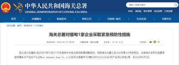 因从进口自缅甸1批次冻干虾仁的2个外包装样本中检出新冠病毒核酸阳性,按照海关总署公告2020年第103号的规定,全国海关自即日起暂停接受缅甸水产品生产企业MyatAnnawarAungCo.,Ltd(在华注册编号为CMMR18PP1810010048)的产品进口申报1周,至2022年6月2日。