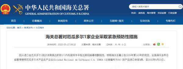 海关总署对厄瓜多尔1家企业采取紧急预防性措施
