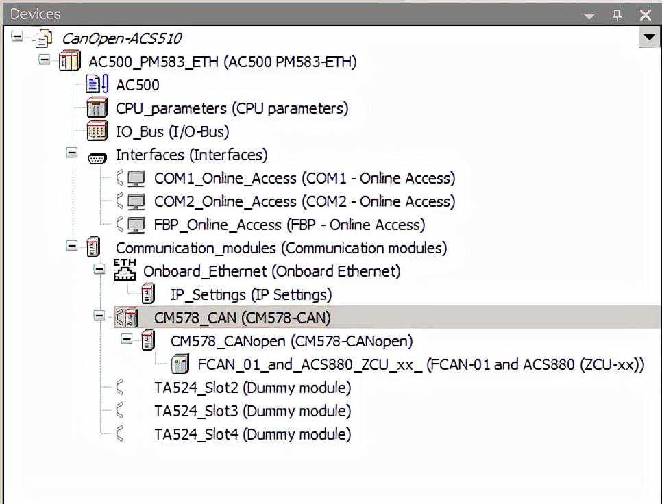 a.在AC500组态软件中建立工程并配置好硬件组态并导入需要的eds文件。注意eds文件要与使用的变频器型号、版本相对应