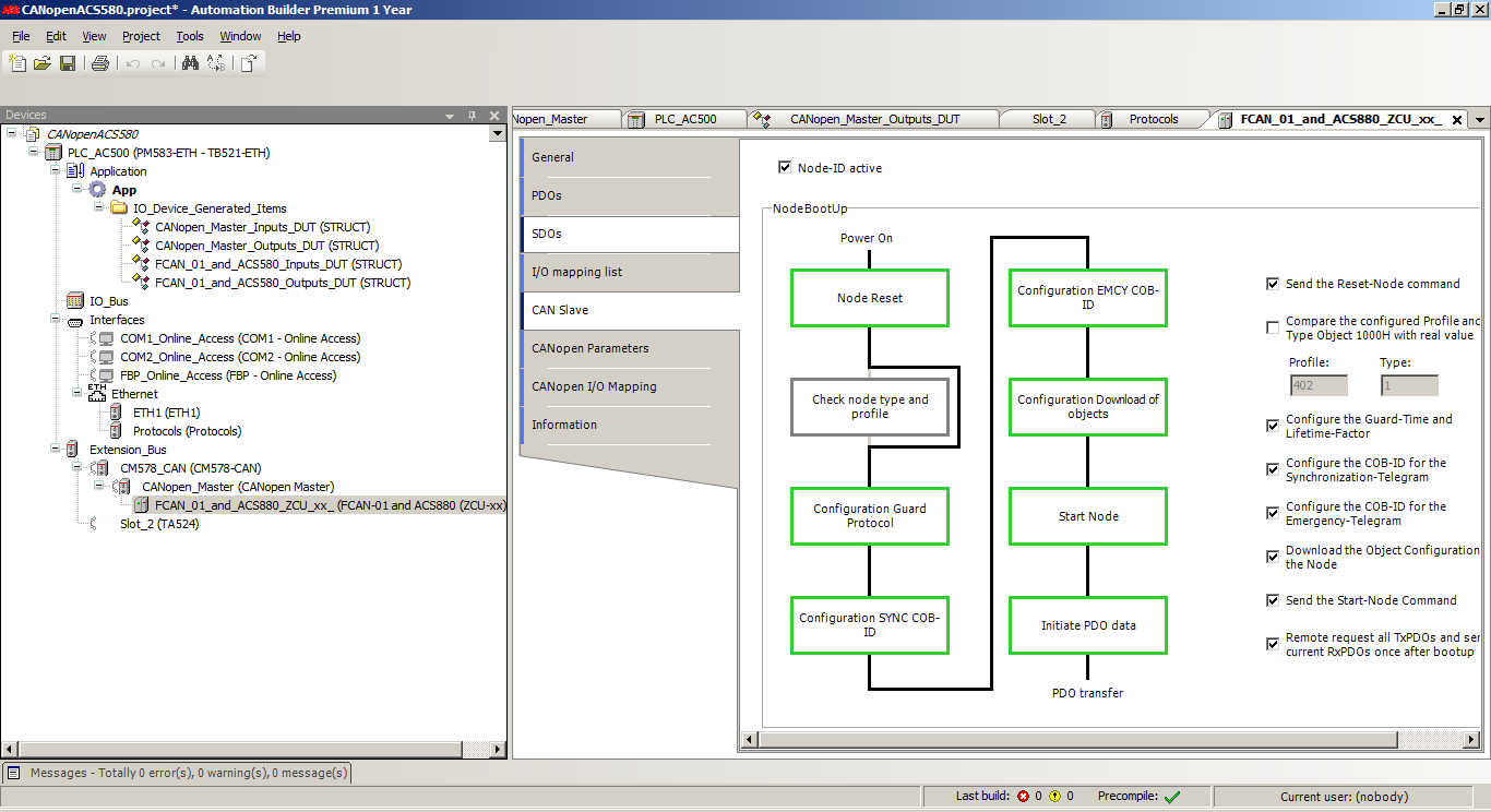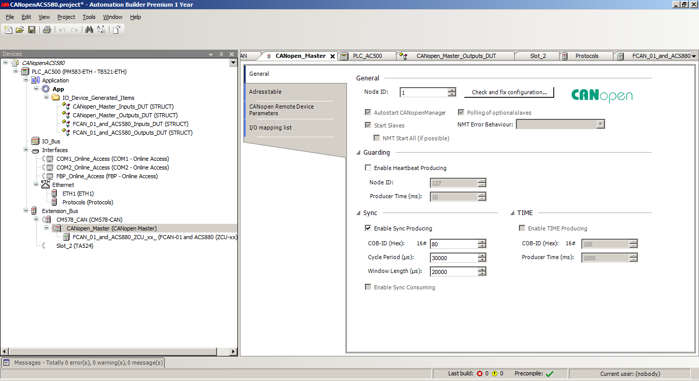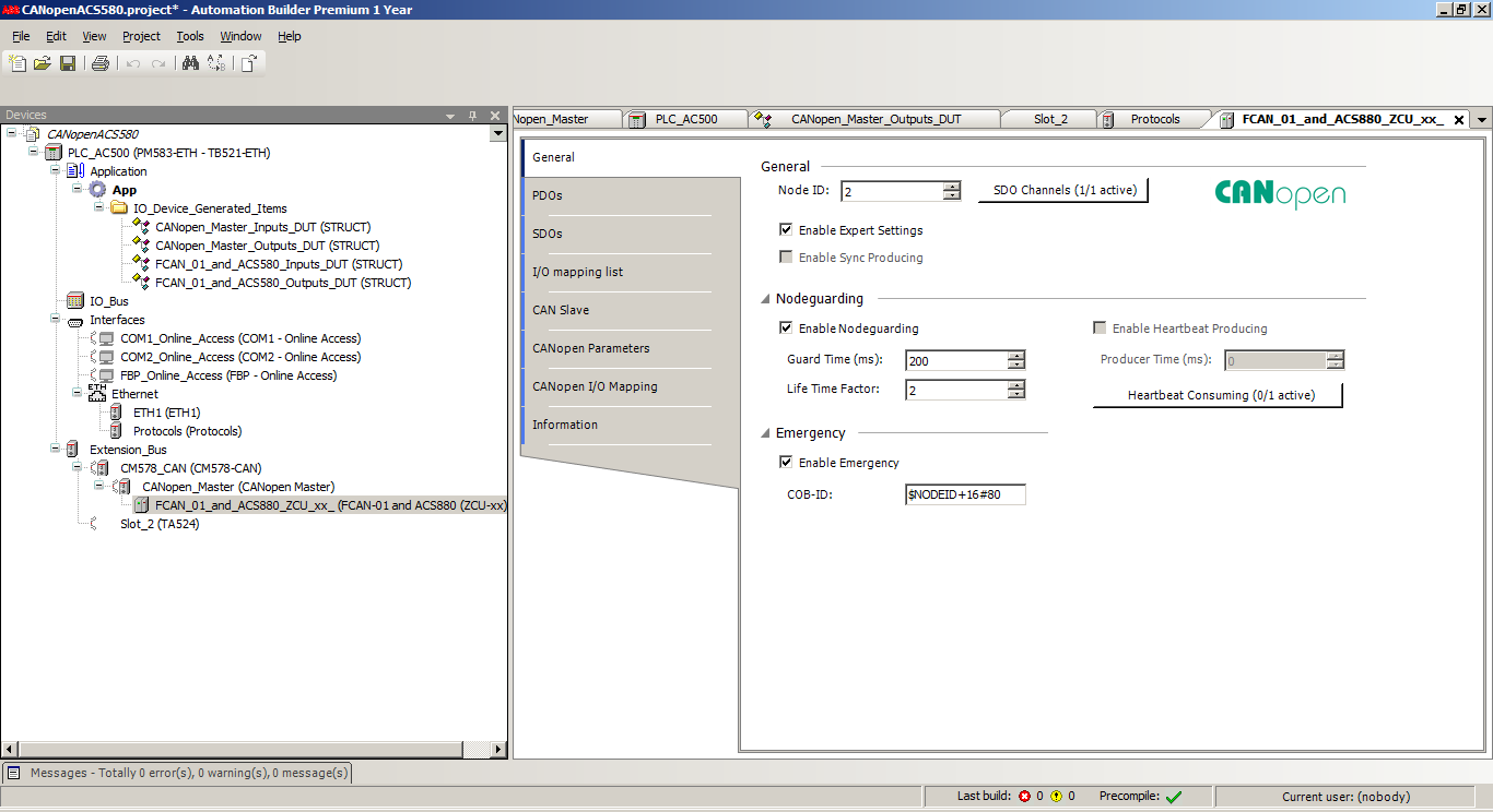 d.配置变频器从站设置,NodeID要设为与变频器一致。建议开启Nodeguarding,以使从站掉线又恢复时可以自动回复。