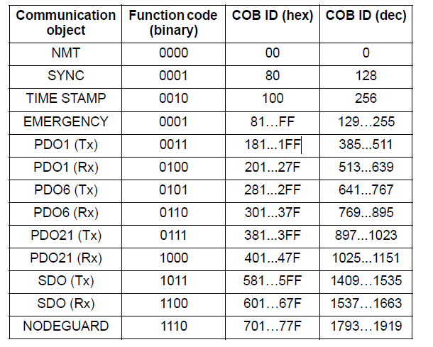 PDO的COB-ID可以设置为表中范围内的任意值,但一般建议将RPDO1的COB-ID设为200h+节点号,TPDO1的COB-ID设为180h+节点号,这样方便查找。其他COB-ID的建议值见FCAN-01手册。