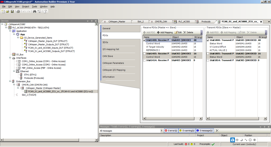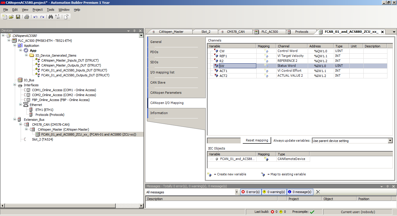 使用的硬件:ACS355/M1/850/380/580/880变频器+FCAN-01模块,ABBAC500PLC+CBP/ABP组态软件