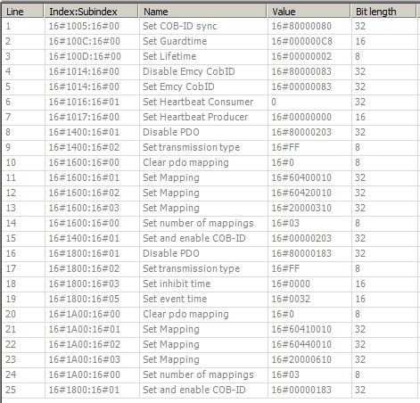 补充说明:大部分PLC或CANopen网关都可以在CANopen总线pre-operational状态时使用SDO自动初始化总线参数,如果需要手动配置,请参考下表,此表是CBP/ABP根据本例配置自动生成的:
