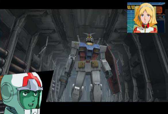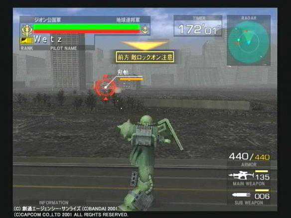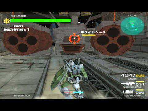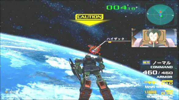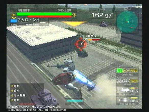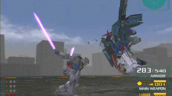 按键虽然不多,但《连VS吉》对于机体武装设定的还原可不输给其他游戏,比如联邦军这边的机体,副射击一般都是头部机关炮,而吉翁军的机体副射击花样就很多了,扎古用得是手雷,老虎用得是电热棒,勇士用得则是回转光束薙刀。