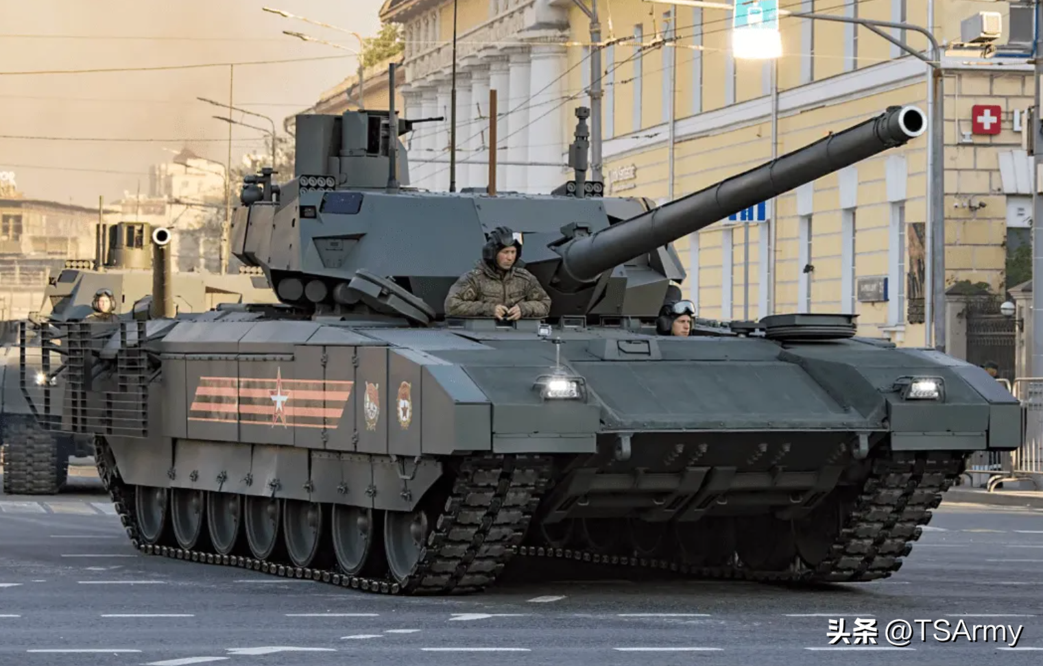在2020年阅兵中出现的一种新式坦克,炮塔和土黄色涂装酷似美制艾布拉姆斯M1A2型,底盘部分又很像俄制阿玛塔T-14型,外表很光滑,具有很强的未来感,但这种新式坦克的详细内容目前很少。