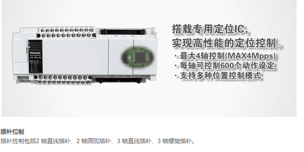 接下来是松下的FP-XH系列PLC,此款PLC拥有很高的性价比,因此也是很多客户的首选产品。此款PLC最大支持6轴,且6轴最大可同时输出100KHZ,而且支持最大5通道的通信,拥有以太网通信插件,可设定PLC的设备站号,进行远程以太网通信。(另FP-XH系列PLC拥有运动专用型,能够方便的进行复杂的运动控制,如圆弧插补,三轴直线插补,三轴螺旋插补等控制)下面上图