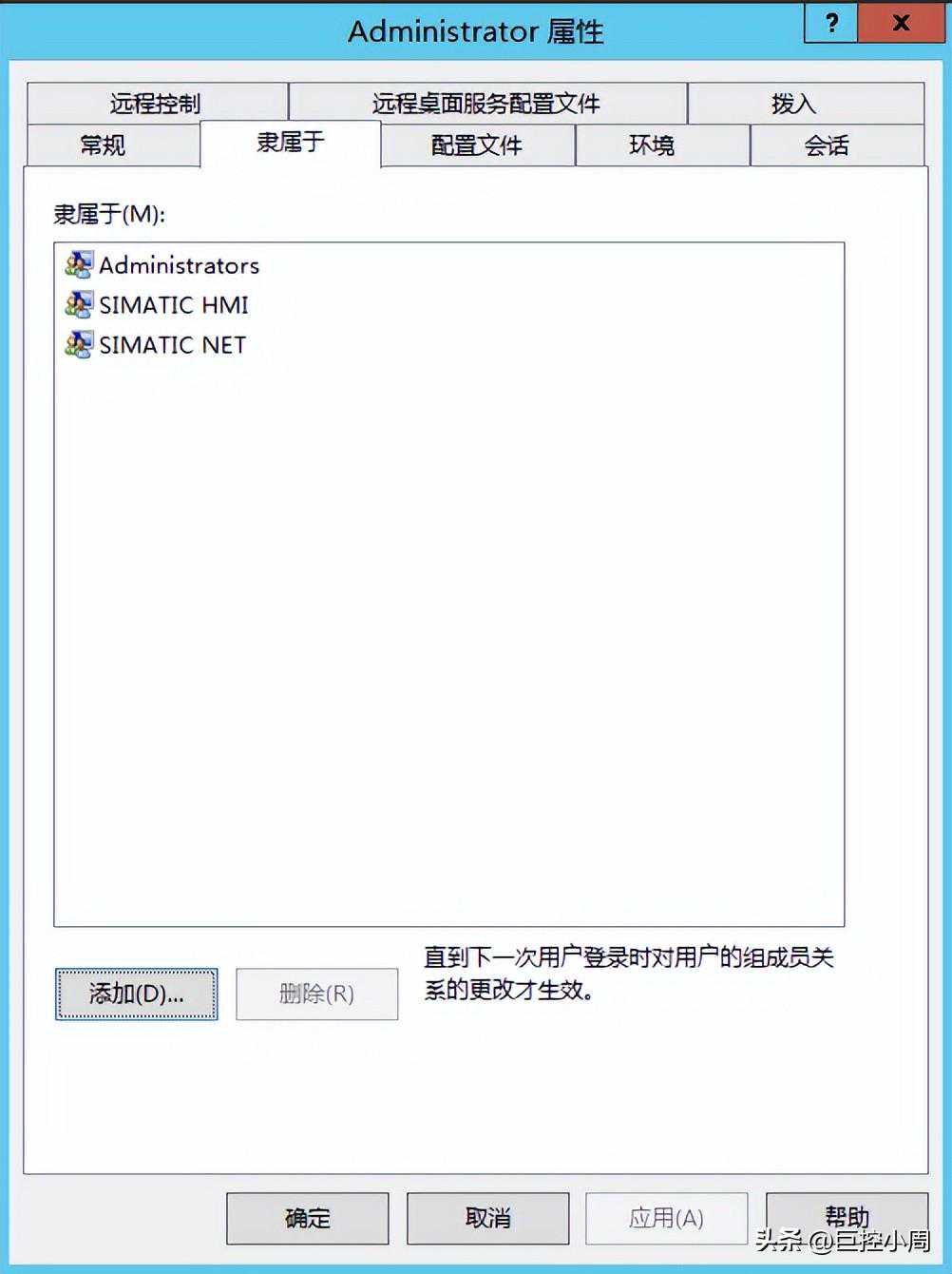(3)对于新建用户,在隶属于中,为用户分配Administrator,SIMATICHMI二个用户组。对于默认Administrator用户,检查是否属于上述二个组,如图2所示。