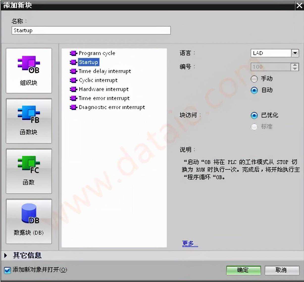 在项目树下选择“CPU1215CDC/DC/DC”→“程序块”→“添加新块”,在弹出的窗口中选择“OB组织块”→“Startup”,添加启动OB100,如下图4所示: