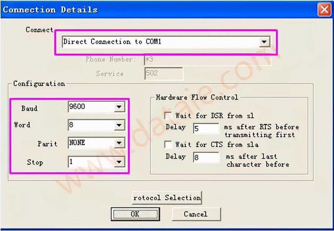 以下以传输率=9.6Kbps,奇偶校验=无奇偶校验,数据位=8位字符,停止位=1,其它保持默认设置为例。