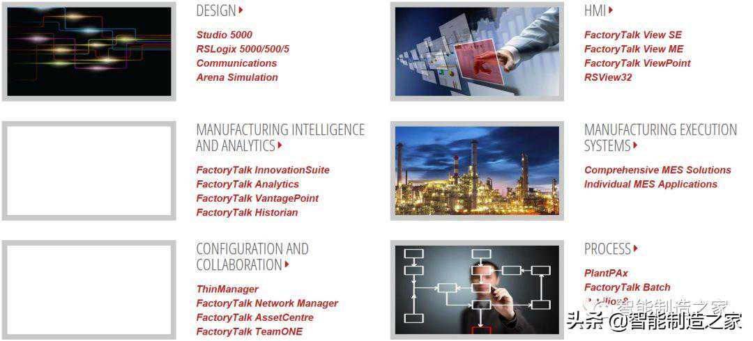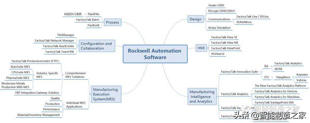 作为工业自动化和信息化领域的国际知名企业,罗克韦尔自动化(RockwellAutomation,以下简称RA)的软件体系包含了从工业自动化到信息化管理软件等,从罗家官方信息来看,主要包含6个方面:设计(Design)、HMI、制造智能与分析(ManufacturingIntelligenceandAnalytics)、制造执行系统(ManufacturingExecutionSystems)、组态与协作(ConfigurationandCollaboration)、过程控制(Process)。