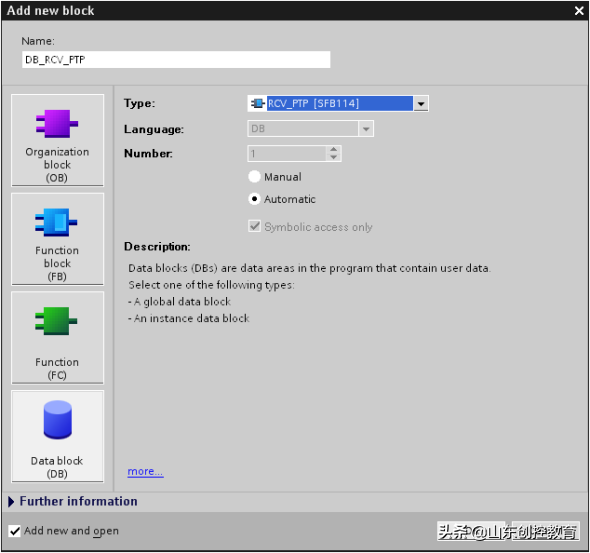 要对RCV_PTP赋值参数,首先需要创建RCV_PTP的背景数据块和发送缓冲数据块,双击“Devices”——“PLC_1”——“ProgramBlock”——“Addnewblock”,在弹出的窗口命名DB_RCV_PTP,选择DB块,在Type后选择“RCV_PTP(SFB114)”