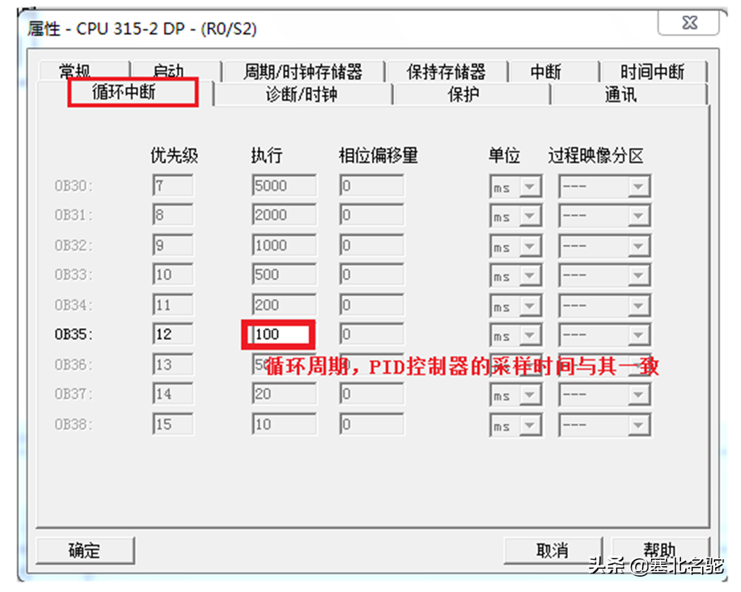应在启动时执行的组织块OB100或在循环中断(如OB35)中调用FB41-FB43。PID的采样周期应设置为与OB35的循环时间间隔一致。