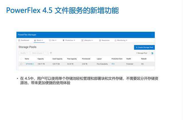 存储池方面,从开始,块数据与文件数据可以同时存储在后端的一个集群上了,只要划分出不同的逻辑卷即可,处理更加灵活。“以前在的时候,客户还会进行分区,一部分用来给NAS服务器用,一部分用来给块存储,但升级到以后,就能使用单个存储池轻松管理和部署块和文件存储了。”李磊表示。