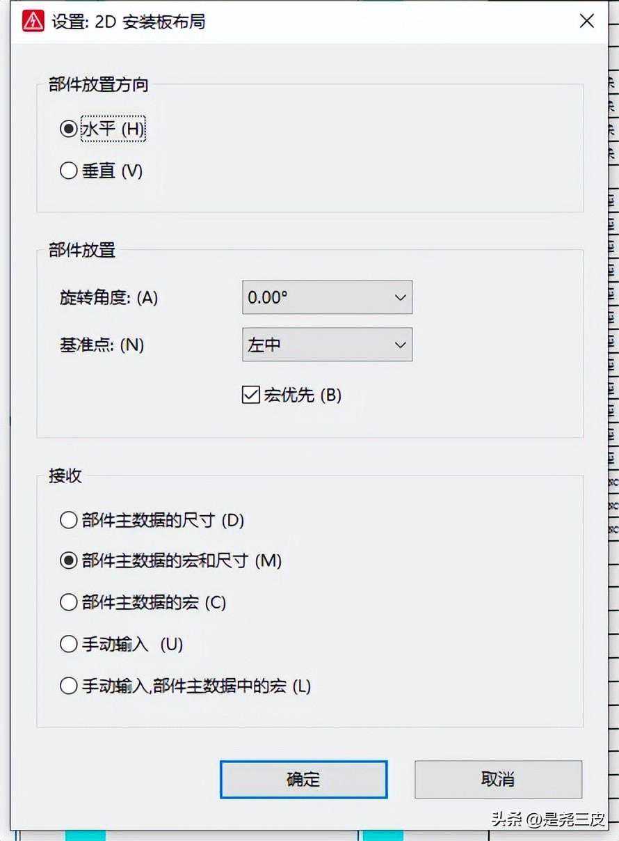 宽度、高度、深度和安装间隙的尺寸为部件放置的属性,并被保存在部件数据库或部件宏中。通过设置:2D安装板布局对话框中的设置(弹出菜单设置)可确定,应如何导入此数据。