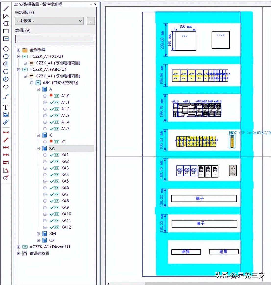 Eplan软件除单纯使用附属图表和列表来创建原理图外,还可用来设计箱柜及安装板,此时只能在项目页上以"安装板布局"类型来创建安装板。按照面向对象的方式绘制好原理图后,可以在安装板上对电气元件、安装线槽与导轨、元件安装的开孔数据等进行合理的布局,除了安装板,同样可以完成箱柜门板和侧板的元件布局设计。