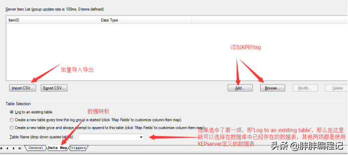 在项目中对于设备的数据存储,一般的方案都是kepserver(以下简称Kep)负责采集,把数据传送给应用程序客户端,再通过应用程序客户端存储到数据。考虑到传输的环节过多,容易造成通讯中断,从而导致数据的丢失或者处理不及时,而且过多的环节也增加了项目维护的成本,因此能否在不影响当前功能的情况下,减少中间的环节?答案当然是可以的,Kep作为一个成熟而且稳定的产品,它的功能不仅仅只可以采集数据,同时也具备存储数据的功能。以下介绍对Kep进行配置,以达到实现数据存储的功能。