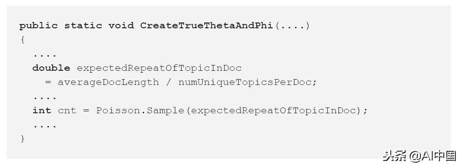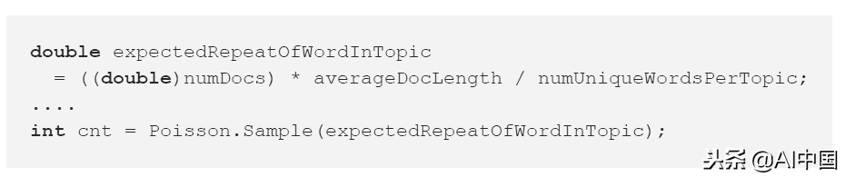 这里有可疑的地方:执行整数除法(variablesaverageDocLength和numUniqueTopicsPerDoc属于int类型),但结果写在double类型的变量中。这引出了一个问题:它是故意制造出来的,还是真正意义上的实数划分?如果变量expectedRepeatOfTopicInDoc属于int类型,这将禁止可能的问题。