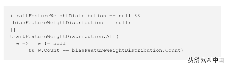 同样,运算符||的右操作数仅在评估左边的结果为false时才进行评估。左操作数可以取false值,包括traitFeatureWeightDistribution==null和ofbiasFeatureWeightDistribution!=null。然后是运算符||的右操作数将被评估,并调用,所有这些操作将导致抛出ArgumentNullException。
