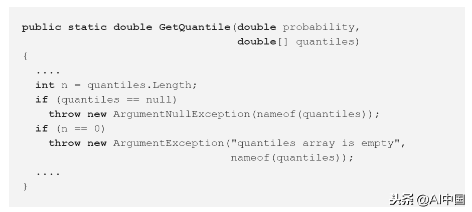 请注意,访问属性,然后检查分位数是否为null。最后,如果quantiles==null,该方法将抛出异常,但是错误的异常会被抛出到错误的位置。可能是线条倒置了。
