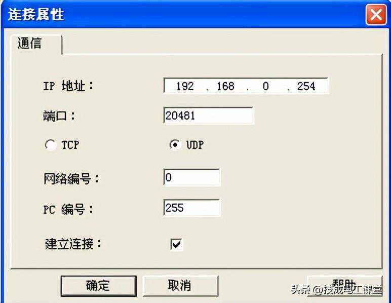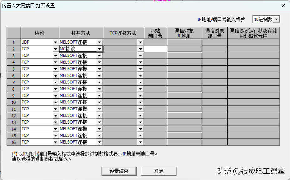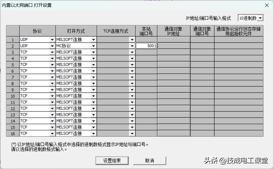 注意,端口号为PLC的通讯端口(十进制),网络编号和PC编号默认即可。