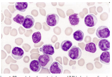 外周血涂片是最为关键的检查之一,为诊断提供了首要线索。涂片可见核浆比较高的幼稚淋巴细胞。在50%的病例中,可见圆形或卵圆形的细胞核,其余患者细胞核不规则,并通常伴有褶皱(但不如Sezary细胞或ATLL细胞显著)。典型的T-PLL细胞具有明显的核仁与嗜碱性的包浆。此外,T-PLL具有两者形态学的变异型,小细胞变异型和脑形变异型,这两者约占所有患者的20%左右。这两种变异型与典型的T-PLL具有相似的免疫表型,细胞遗传学和临床特征。