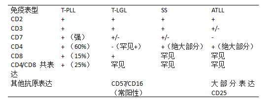 T-PLL与T大颗粒淋巴细胞白血病(T-LGL)、ATLL、Sezary综合征(SS)和外周T细胞淋巴瘤,需要整合临床信息和实验室检查(外周血形态、组织学、免疫表型和遗传学特征)。