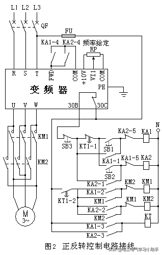 图2中电位器RP是频率给定元件;30B和30C是变频器的保护出口继电器触点。