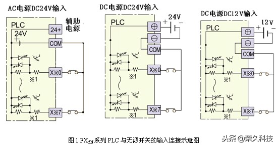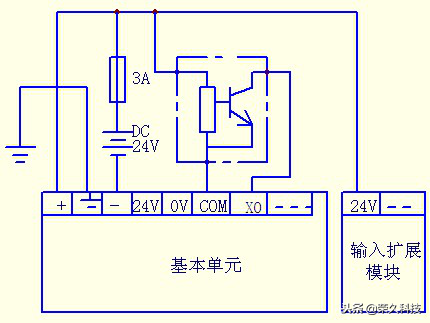 如光电开关等传感器开关器件,其输入部分接直流电源(可接PLC的内部24V输出电源),其输出部分接在输入端子和输入公共端子两点之间。