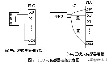 接近开关指本身需要电源驱动,输出有一定电压或电流的开关量传感器。开关量传感器根据其原理分有很多种,可用于不同场合的检测,但根据其信号线可以分成三大类:两线式、三线式、四线式。其中四线式有可能是同时提供一个动合触点和一个动断触点,实际中只用其中之一;或者是第四根线为传感器校验线,校验线不会与PLC输入端连接的。因此,无论那种情况都可以参照三线式接线。图2为PLC与传感器连接的示意图。