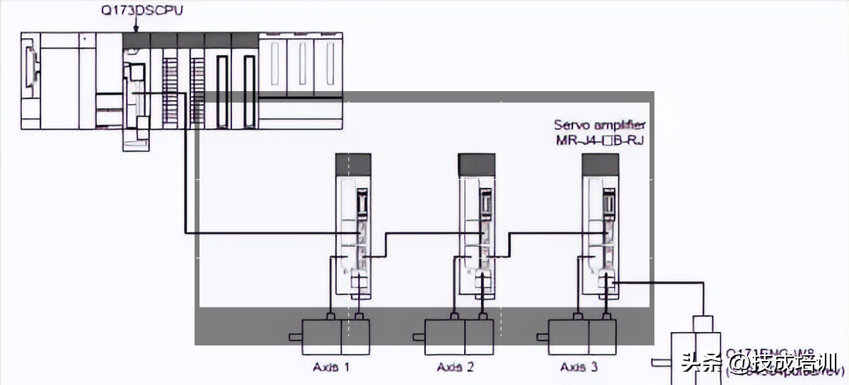 再比如另一种情况,假设三菱PLC模块QD77MS控制的16轴需要进行同步控制,但是主轴是来自其他模块控制的或者其他系统的三菱伺服放大器,则其不能当作伺服输入轴,而需要通过三菱PLC同步编码器轴进行输入。