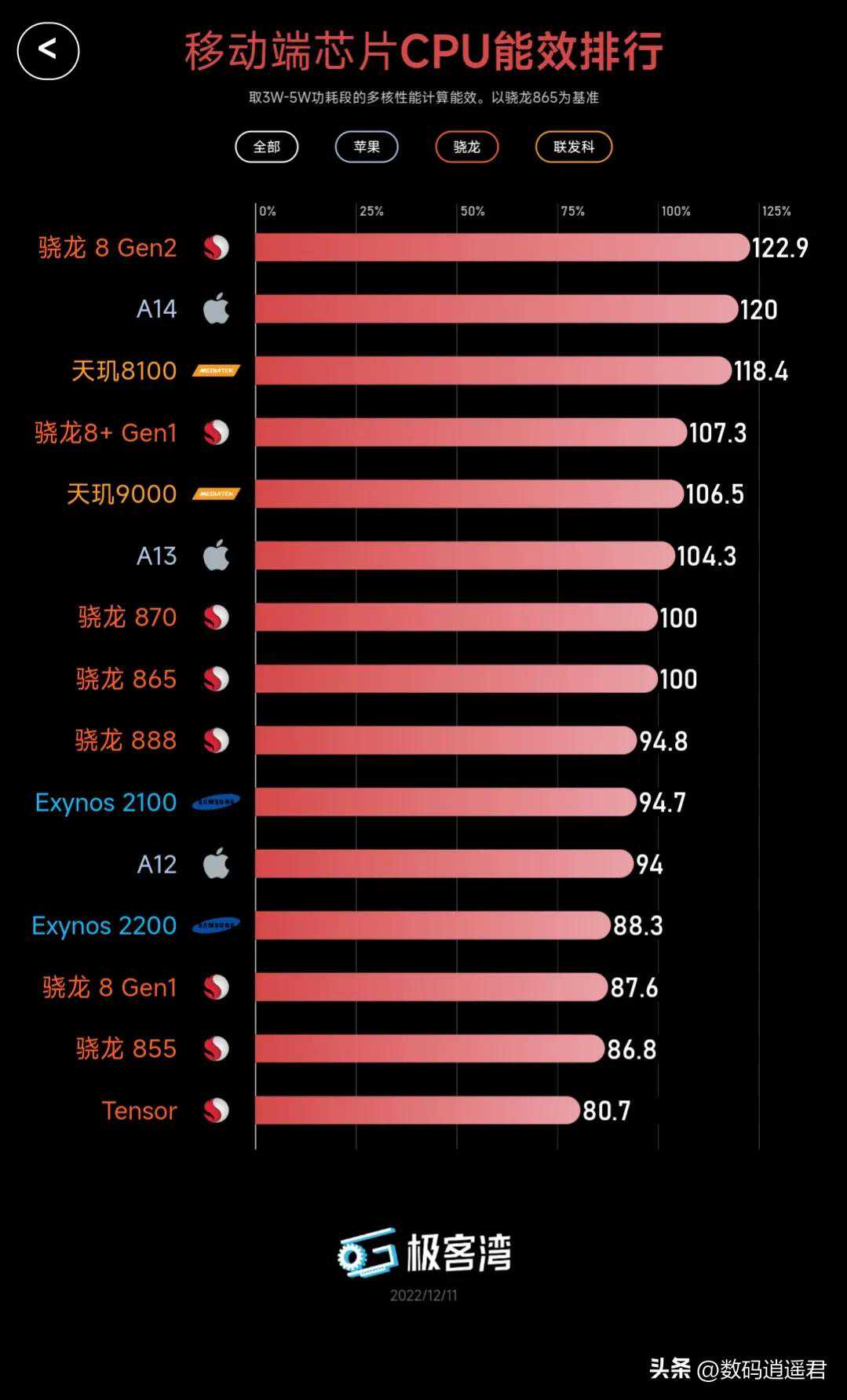 这一代的GPU升级幅度特别大,规格升级的同时最高频率还降低了,所以它的图像处理性能提升明显,能效反而提升了。CPU为什么这一次采用1+2+2+3的组合?以骁龙8+的3个A710和骁龙8Gen2的2个A715和2个A710为例,可以用4个更低的频率达到骁龙8+3个高频的效果,这个能效来说是巨大的提升。