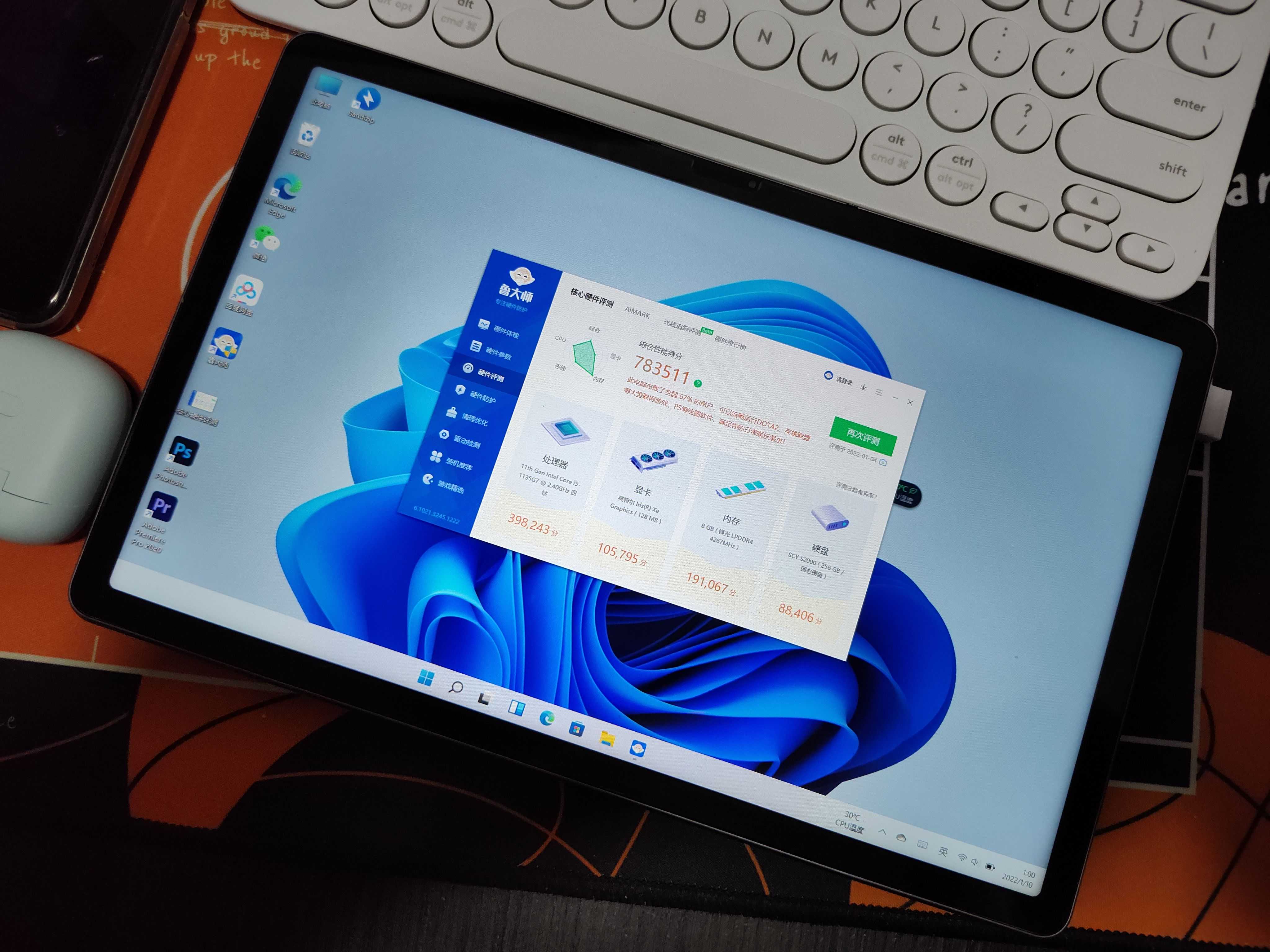 我们先来看看核心配置。我拿到的这台是高配的版本,它搭载了最新的第十一代i5-1135G7处理器、英特尔锐炬®Xᵉ显卡、8GBLPDDR4x内存和全新的,还有超薄高转速大风量风扇散热,这个配置都能做哪些事情想必就不用我多说了吧。简单跑了一下鲁大师,得分78W。这样一套核心配置下来的二合一本的价格还不到4000块,还不到相同处理器和储存版本SurfacePro8一半的价格。