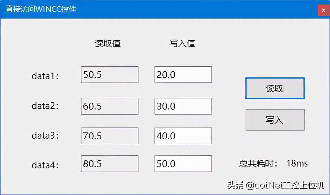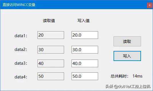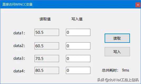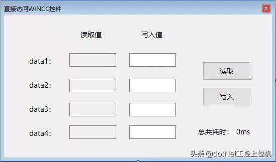 ///summary///写入变量////summary///paramname="ser"/param///paramname="e"/paramprivatevoidbtn_Write_Click(objectser,EventArgse){//开始计时();//写入变量try{dynamicdata1=["NewPdl1"].ScreenItems[".NET控件1"];dynamicdata2=["NewPdl1"].ScreenItems[".NET控件2"];dynamicdata3=["NewPdl1"].ScreenItems[".NET控件3"];dynamicdata4=["NewPdl1"].ScreenItems[".NET控件4"];=(_);=(_);=(_);=(_);}catch(Exception){("写入失败");return;}//显示耗时_=()+"ms";}4、读取结果如下所示: