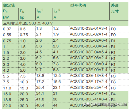 表一、ACS310型号和额定值