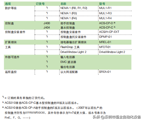 列表所示的可选件在ACS310范围内适用。每个可选件都对应一个4位数字的选择代码,如第二列显示。这个代码代替上面型号代码中的XXXX。
