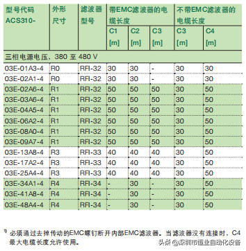 ACS310内部的EMC滤波器用于满足EN/IEC61800-3标准的C3类要求。外部EMC滤波器与内部EMC滤波器相配合,用于加强传动电磁性能。最大电机电缆长度由电磁性能决定,如下表: