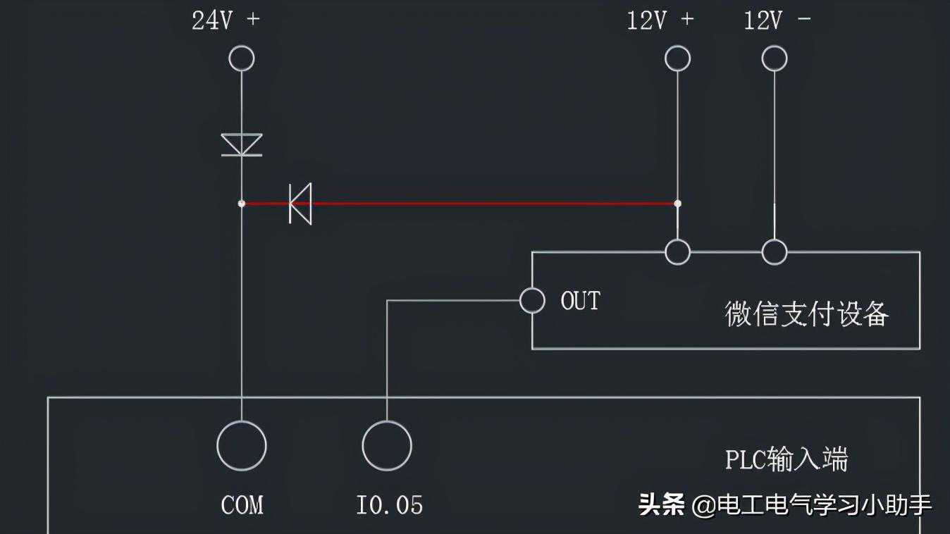 朋友与我讨论,分析失败的原因。我认为最大的问题是新加入的微信支付设备没有在PLC输入端电路中构成回路。我也不知如何办。这个时候,朋友说他有办法。该朋友的电子电路水平比我高,一下子就给出了方案:加两个二极管,把两个直流电源同时输入到PLC的输入端。示意图如下,其中最关键的就是图中的“红线”!