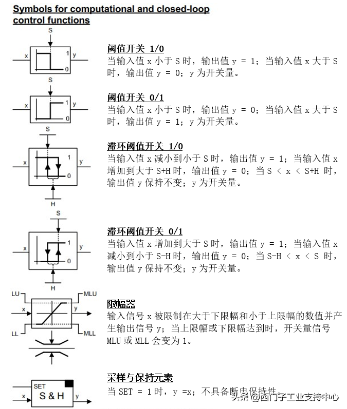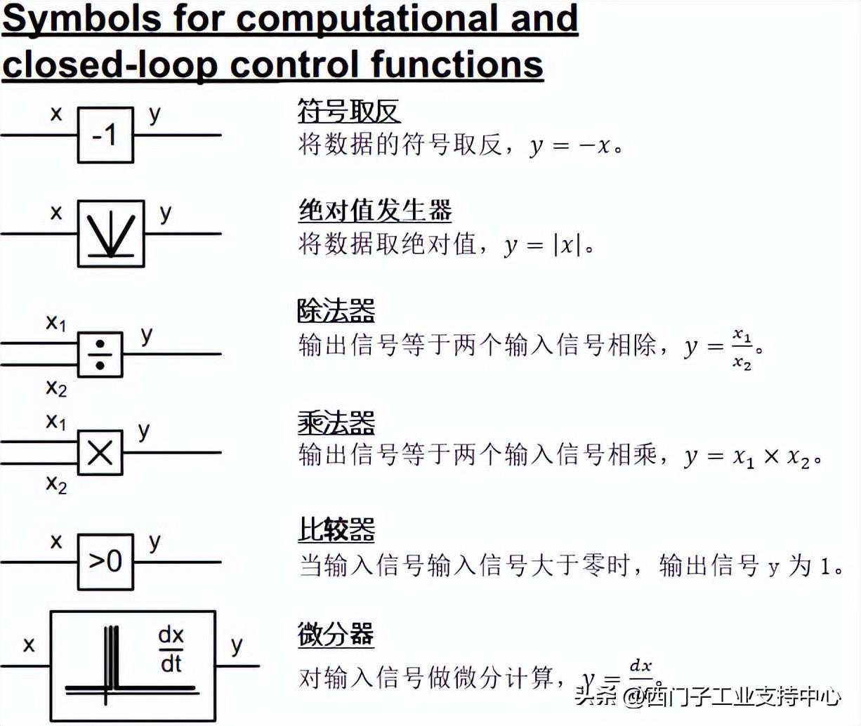 逻辑功能符号主要用来表示信号之间的运算以及闭环控制的相关信息,部分元素的具体含义如下图。