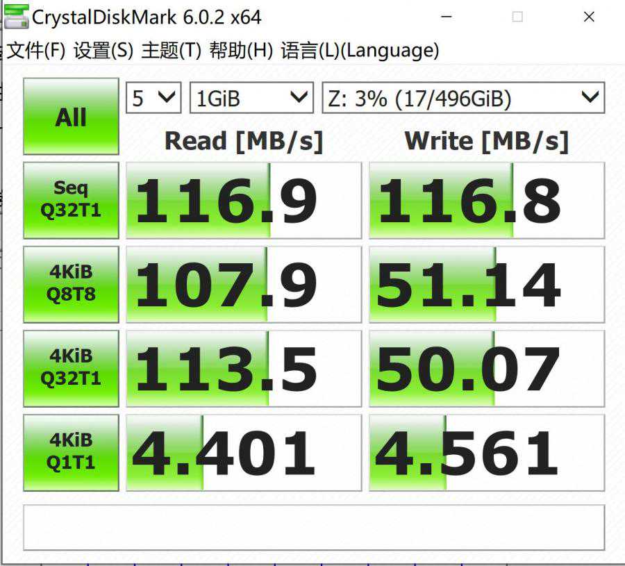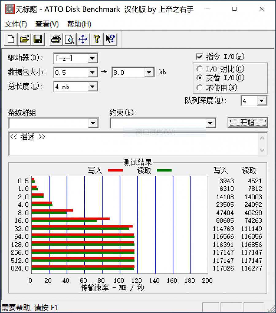 通过ATTODiskBenchmark测试的最高读取速度为117.14MB/s,最高写入速度为117.14MB/s。