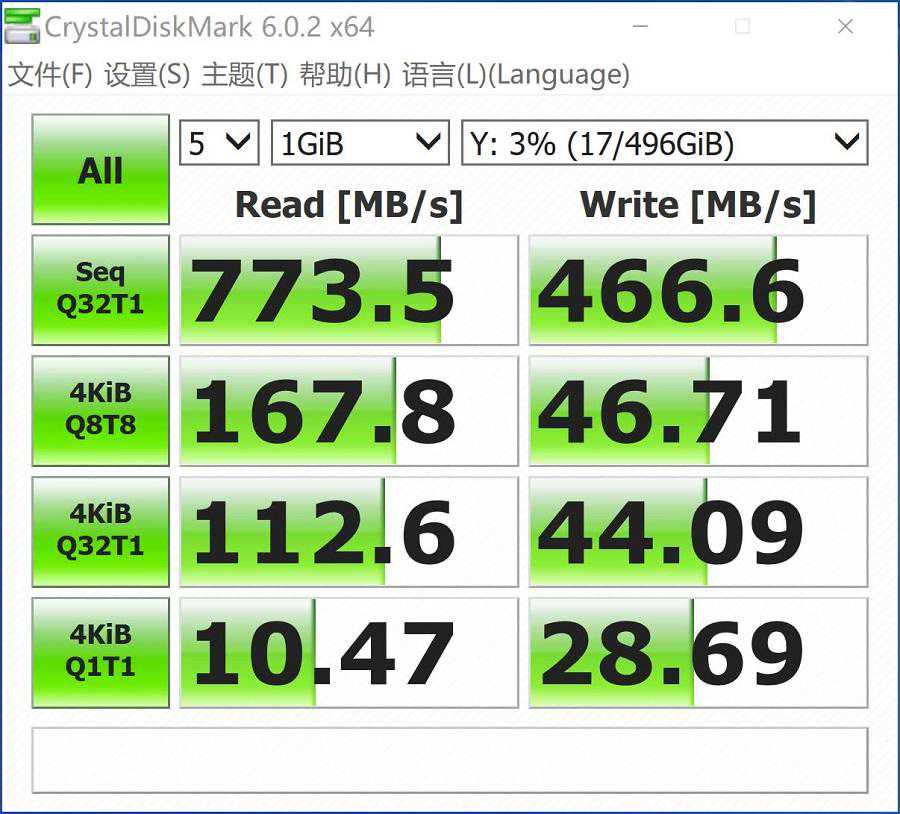 通过CrystalDiskMark测试的读取速度为773.5MB/s,写入速度为466.6MB/s。