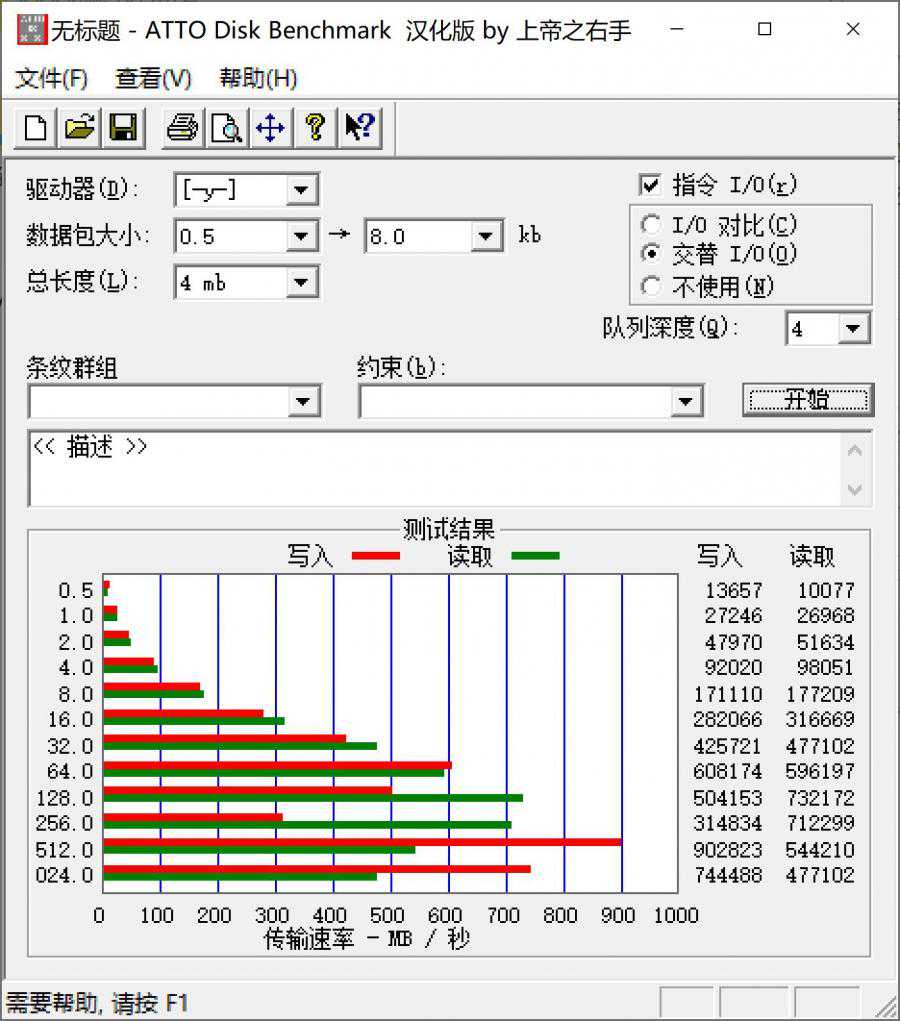通过ATTODiskBenchmark测试的最高读取速度为732.17MB/s,最高写入速度为902.82MB/s。