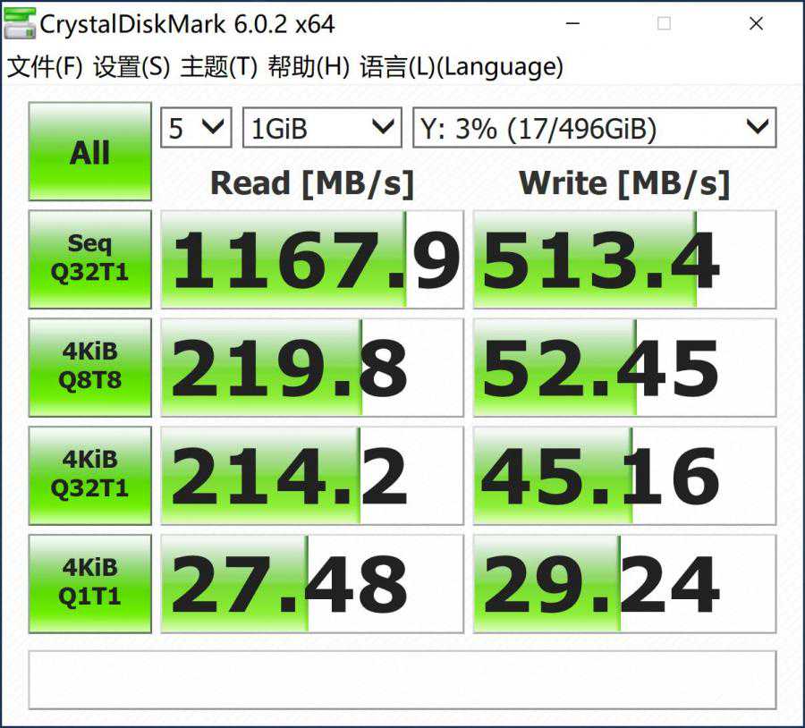 连接完成后,通过CrystalDiskMark的测试的读取速度为1167.9MB/s,写入速度为513.4MB/s。
