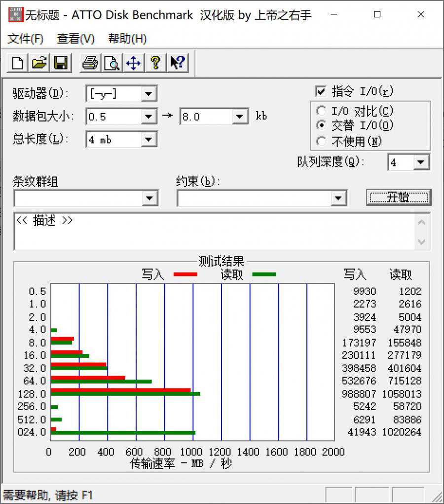 通过ATTODiskBenchmark测试的最高读取速度达1058.01MB/s,最高写入速度达到了988.80MB/s。