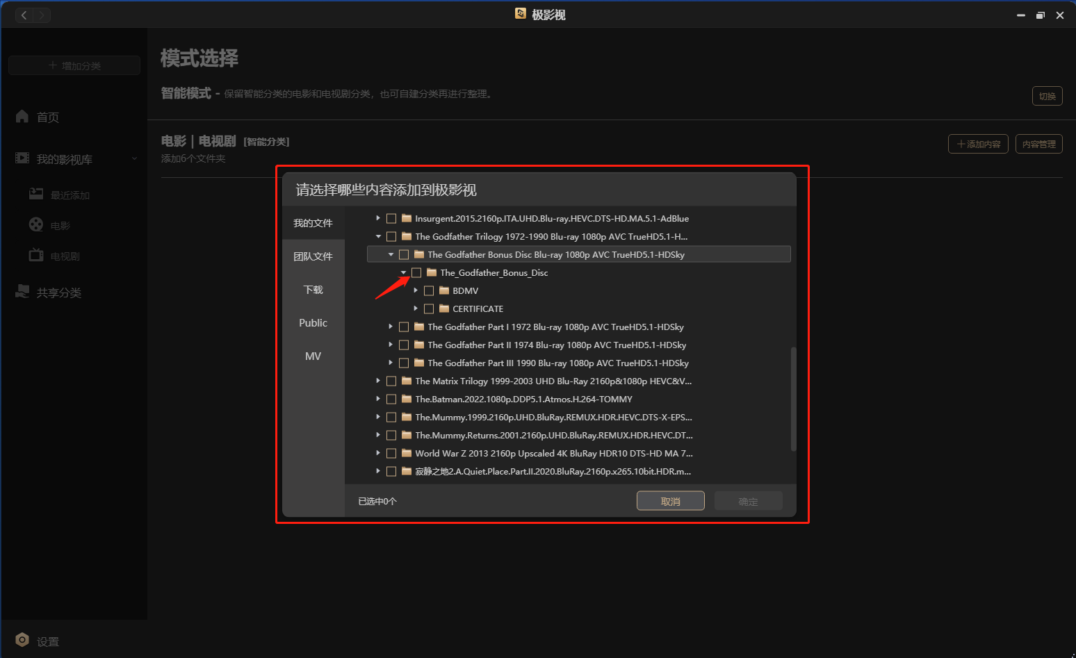 在极影视那边就可以按之前的步骤来添加电影了,添加完成后也是可以自动识别出来海报墙的,我框出来的这三个文件夹都是我威联通里的内容。