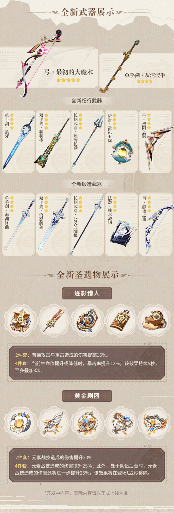 武器中的最初的大魔术弓和灰河渡手单手剑大概率进池子,剩下还有5把纪行武器+5把锻造武器,米哈游这是把各个氪金段的玩家都考虑到了。